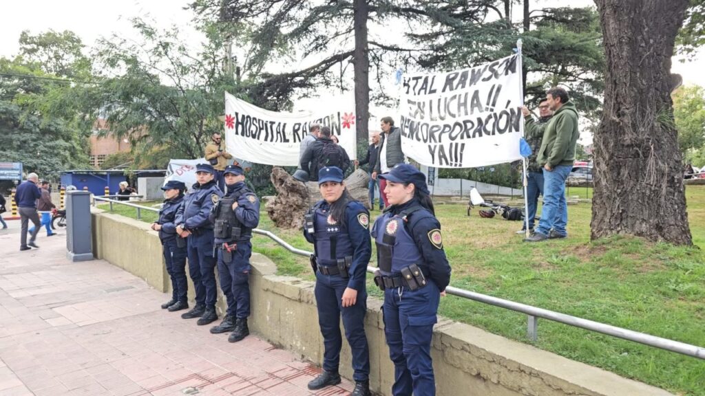 Este lunes, en horas de la mañana cuando trabajadores del Hospital Rawson intentaron armar sus carpas y mostrar sus banderas, los oficiales de la fuerza policial presentes recibieron la orden de frenar esas acciones y los manifestantes decidieron no armar las carpas.