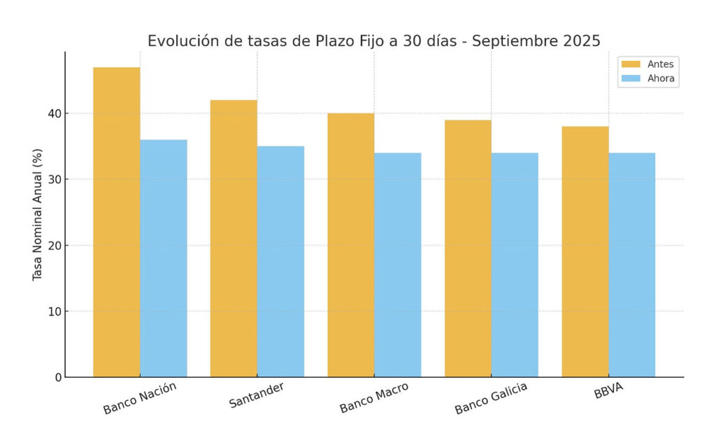El Banco Nación recortó su tasa del 47 % al 36 %. Santander ajustó su propuesta del 42 % al 35 %. Otras entidades como Banco Macro, Banco Galicia y BBVA también bajaron sus tasas, ubicándose en torno al 34–35 %.