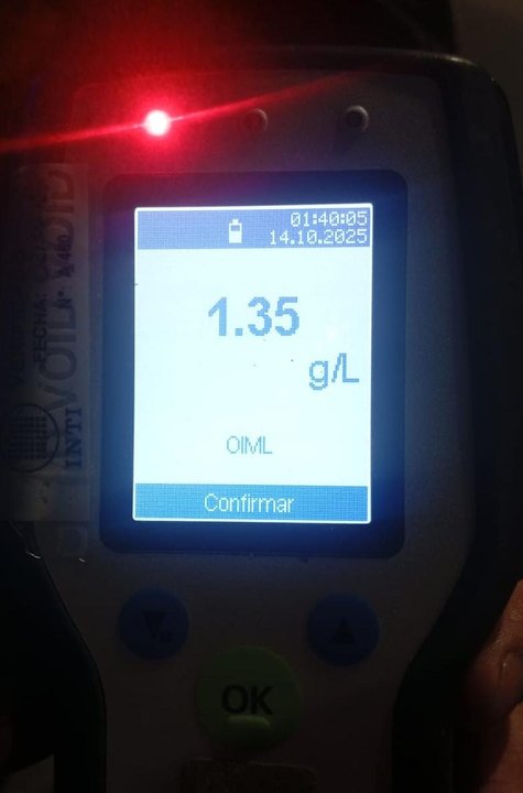 En el interior del automóvil los agentes hallaron una botella de bebida alcohólica y otros elementos. Se solicitó la presencia de la Policía Caminera para realizar el test de alcoholemia al conductor, cuyo resultado arrojó 1,35 gramos de alcohol por litro de sangre, por encima del límite legal.