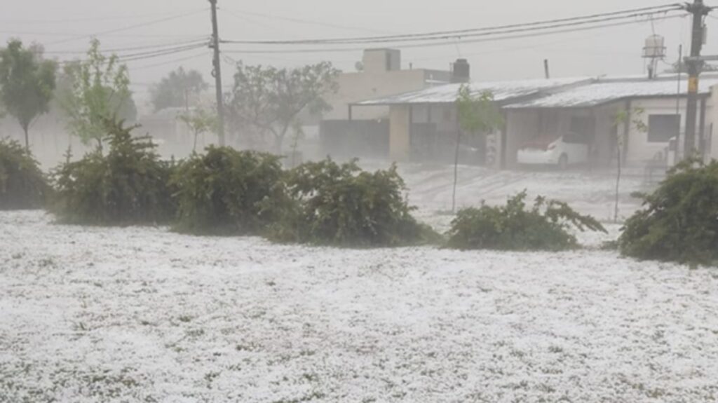 En particular, la localidad de Del Campillo, ubicada a la vera de la ruta nacional 35, dejó postales de veredas y patios cubiertos de blanco por el granizo.
