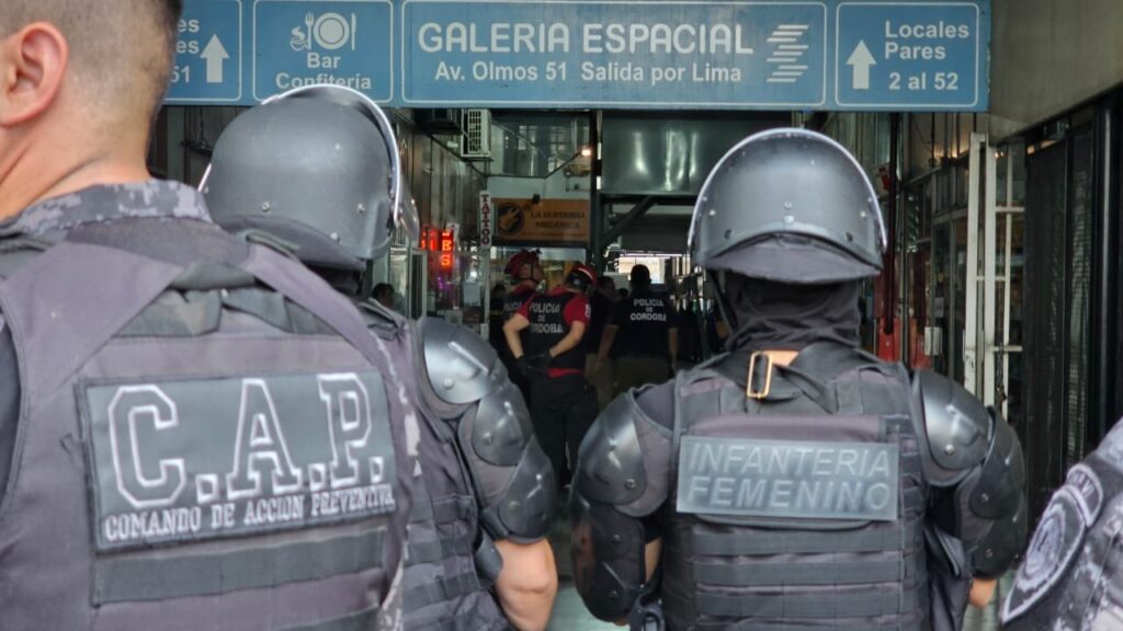 Un megaoperativo se desarrolla en la Galería Espacial, ubicada en Av. Olmos al 51, en el barrio Centro de Córdoba, con más de 40 allanamientos simultáneos.
