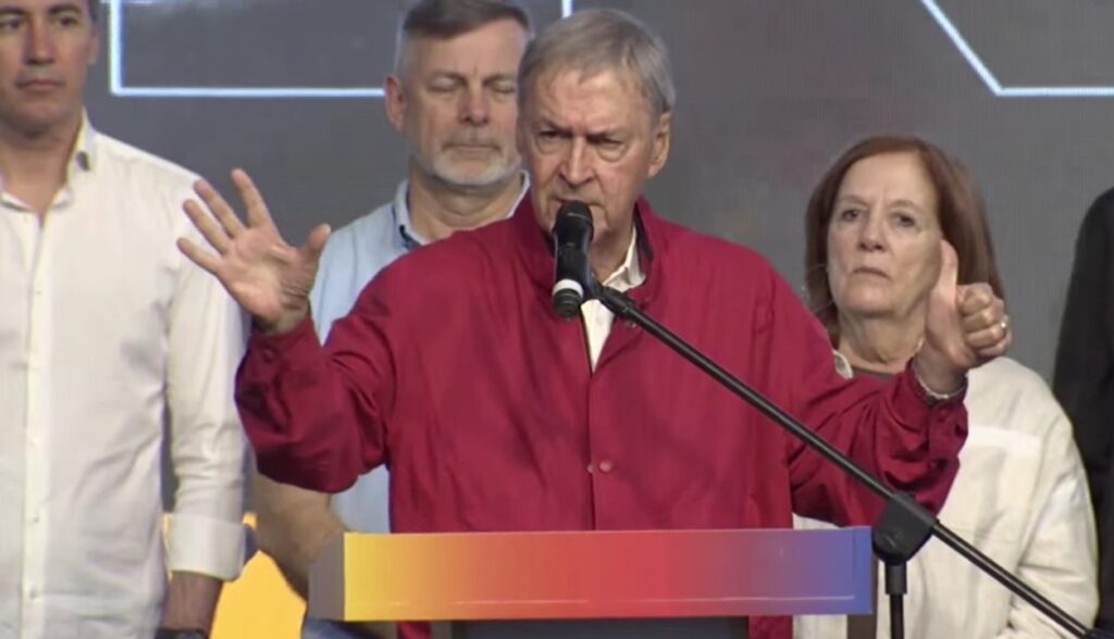 Con su infaltable campera roja y ante la arenga “Olé, olé, olé, olé, Gringo, Gringo”, el diputado electo avaló las palabras de agradecimiento del gobernador para con los cordobeses y felicitó a Gonzalo Roca y a La Libertad Avanza por ser los ganadores en la provincia de Córdoba, como también al resto de las fuerzas que participaron de la elección.