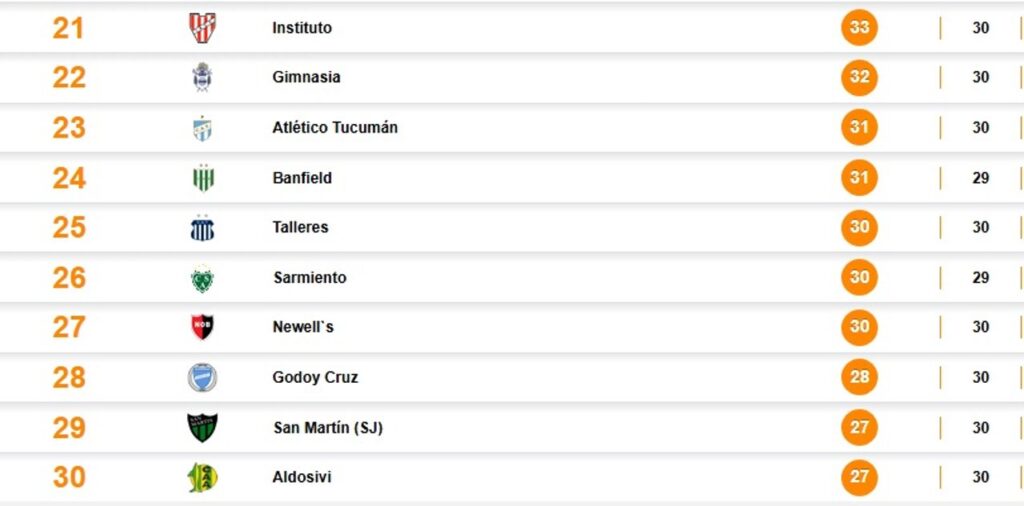 Por encima, Banfield y Atlético Tucumán tienen 31 puntos, Gimnasia 32 e Instituto 33, lo que refleja lo ajustada que está la pelea por evitar la pérdida de la categoría.