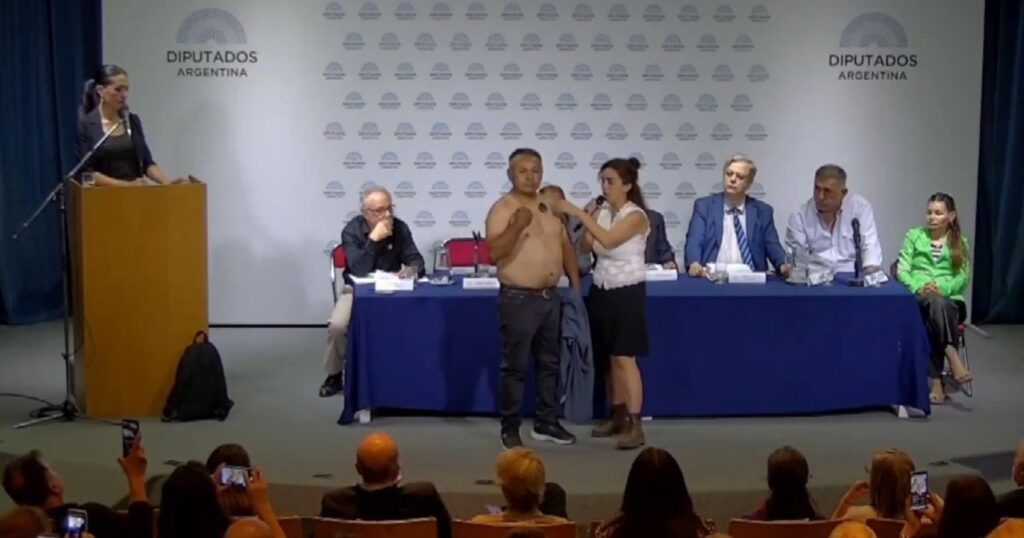 El momento más extraño se dio cuando la licenciada en biotecnología sumariada por el Conicet, Lorena Diblasi, hizo pasar al escenario a quien presentó como José Daniel Fabián, un jardinero al que le pidió que se saque la remera para mostrar que se le “quedaban pegados” elementos metálicos, desde cosas pequeñas hasta un celular.