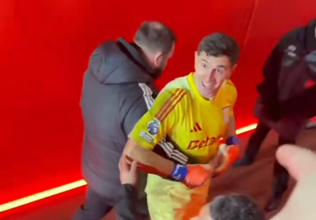 Luego del partido, el arquero marplatense fue protagonista fuera del campo de juego. Un video registrado por un hincha del Arsenal captó el momento en el que Martínez respondió a insultos provenientes de la tribuna mientras se dirigía hacia los vestuarios. La situación se produjo en el túnel del estadio y requirió la intervención de integrantes del cuerpo técnico del Aston Villa para evitar que la discusión pasara a mayores.