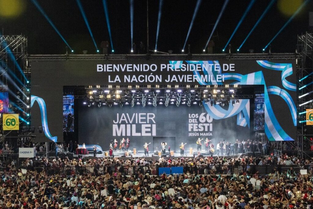 A las 0,45 un gran cartel lumínico proyectado en el escenario le dio la bienvenida al presidente Javier Milei, acompañado por su hermana, la secretaria general de la Presidencia, Karina Milei, el ministro del Interior, Diego Santilli y el presidente de la Cámara de Diputados, Martín Menem.