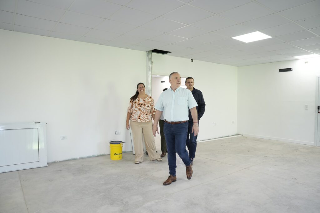 Durante una recorrida por el lugar, Eduardo Accastello, junto a Adela Guirardelli, Martín Ruiz y Rodrigo Fuyana, observaron los avances finales de la obra que permitirá ampliar la formación policial en el interior provincial.