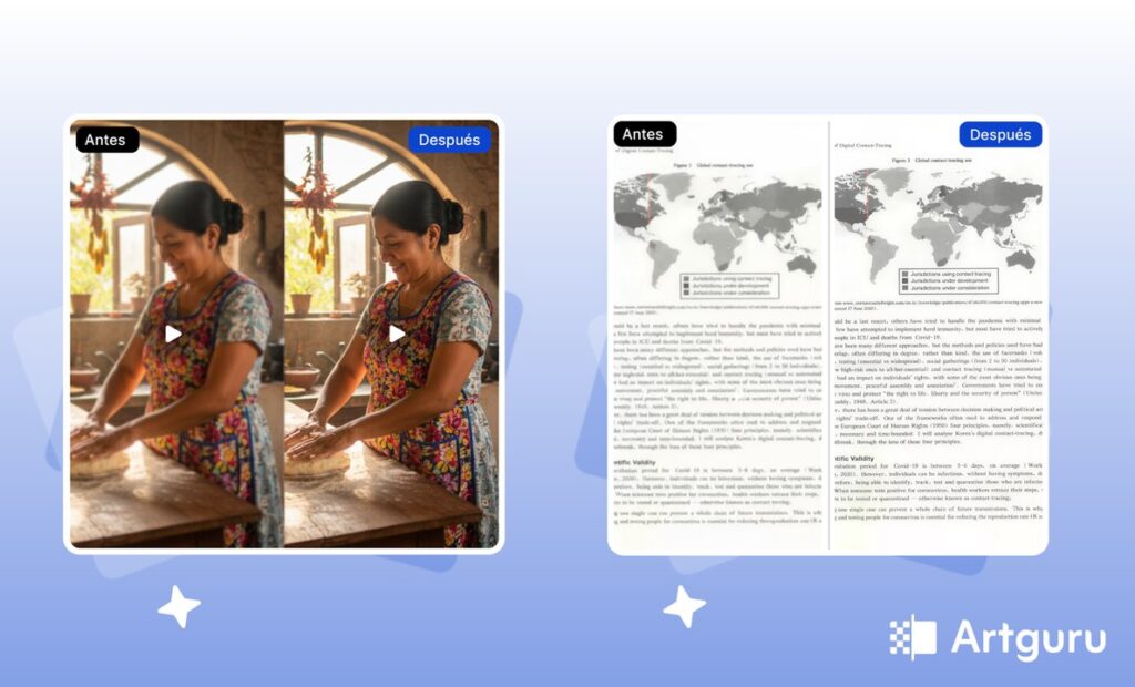 Gracias al uso de inteligencia artificial, Artguru permite mejorar calidad de video e imagen automáticamente, ofreciendo resultados limpios y naturales sin el tiempo y esfuerzo que requieren los métodos manuales.
