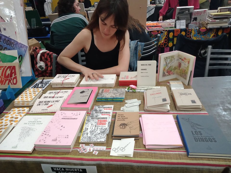 En junio de 2022 recorrimos de civil la feria de editoriales independientes Tilde, en carácter de público quiero decir, con un prototipo de Irremediable guardado en una bolsa de súper. Se lo mostrábamos medio a las escondidas a gente amiga que estaba feriando. Soñábamos con la Manu estar del otro lado de los puestitos. Al cabo de un puñado de años, Vaca Muerta Ediciones peregrina por el país con una valijita de libros y un paño para feriar que se fue enriqueciendo.